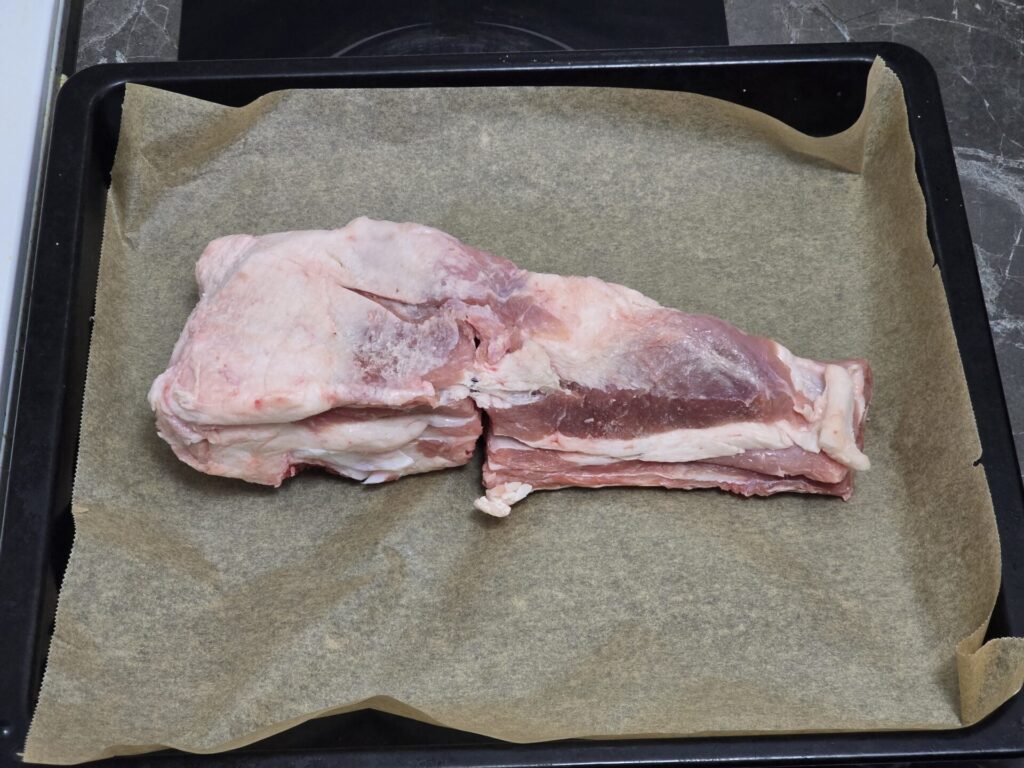 - Place the seasoned veal ribs and brisket in a baking tray (tepsija), bone-side down.