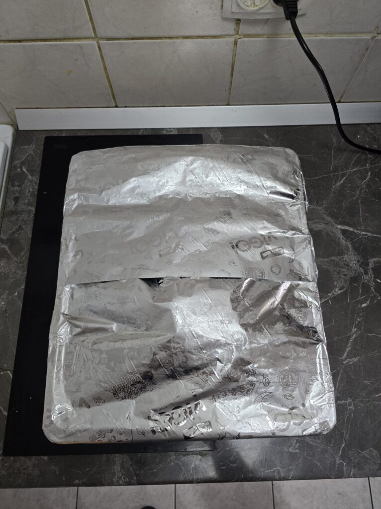 - Cover the tray again with aluminum foil and return it to the oven.
