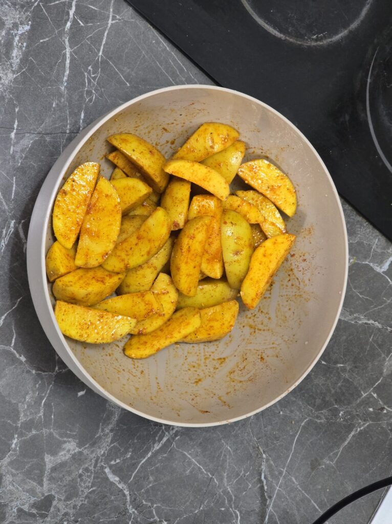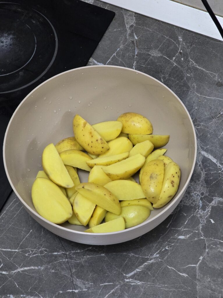 - Prepare the Potatoes – Before the 1-hour mark, wash the baby potatoes (leave the skin on), cut them into quarters, and season with 1 teaspoon of smoked paprika, 2 teaspoons of Vegeta, and 1 tablespoon of olive oil. Mix well.