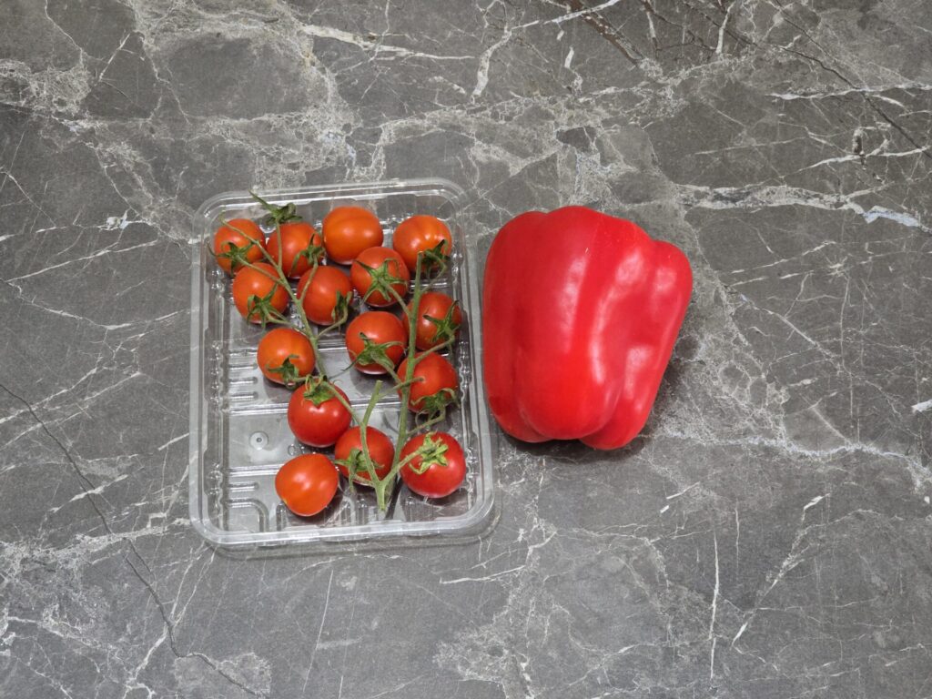 - Wash and chop 1 medium red bell pepper and 5 cherry tomatoes.
